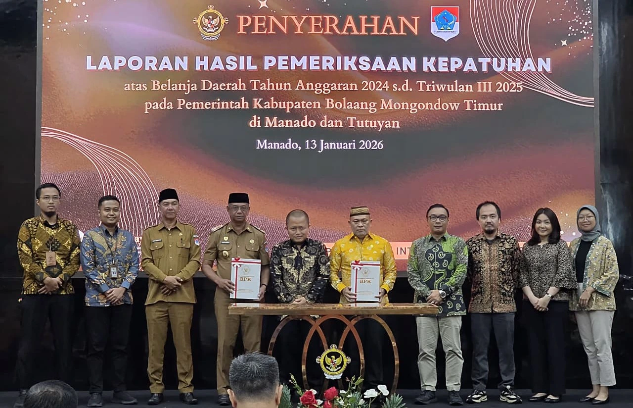 Manado — Bupati Bolaang Mongondow Timur (Boltim) Oskar Manoppo menghadiri penyerahan Laporan Hasil Pemeriksaan (LHP) Kepatuhan atas Belanja Daerah Tahun Anggaran 2024 hingga Triwulan III Tahun 2025 yang dilaksanakan oleh Badan Pemeriksa Keuangan (BPK) RI Perwakilan Provinsi Sulawesi Utara (Sulut), Selasa (13/1/2026) di Manado.