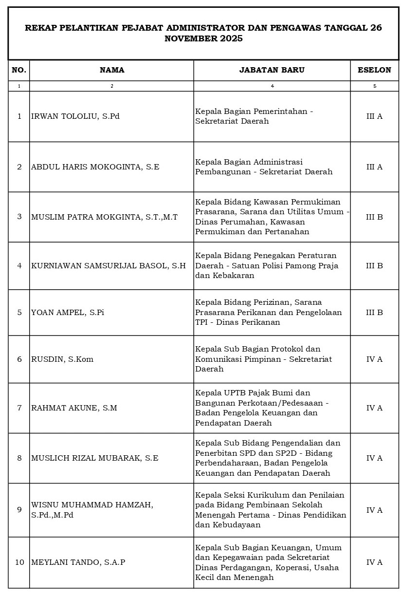 Lantik 22 Pejabat, Bupati Boltim Oskar Manoppo Tegaskan Integritas, Inovasi, dan Kolaborasi sebagai Kunci Kinerja Redaksi BMRPost.idRabu, 26 November 2025 Berikut daftar pejabat yang di lantik Bupati Oskar Manoppo : Bacaan LainnyaMewakili Bupati Boltim, Ikhsan Pangalima Hadiri Penetapan Dua Ranperda Strategis Menjadi Perda dalam Rapat Paripurna DPRDMewakili Bupati Boltim, Iksan Pangalima Kunjungi Unsrat ManadoTP-PKK Boltim Juara Ekshibisi Amal, Comeback Gemilang dengan Kemenangan 6-0 Halaman: 1 2 3 4 Pos terkaitAmpuh Hilangkan Baret Pada Mobil, Gunakan Beberapa Bahan Berikut Lengkap dengan Cara PenggunaannyaFIFA Resmi Lakukan Undian Fase Grup Piala Dunia 2026, Mexico vs Afrika Selatan Menjadi Laga PembukaIngin Membuat Konten Selama Liburan Akhir Tahun 2025, Berikut 4 HP Harga 2 Jutaan Terbaik Merek SamsungBuka Rakor Penyelenggaraan Pemerintahan Desa, Bupati Yusra Alhabsyi Tekankan Kualitas Pelayanan PublikPemkab Bolsel Menghibahkan Lahan 3 Hektar untuk Pembangunan Gudang Bulog Sebagai Bentuk Dukungan Program NasionalMewakili Bupati Boltim, Ikhsan Pangalima Hadiri Penetapan Dua Ranperda Strategis Menjadi Perda dalam Rapat Paripurna DPRD