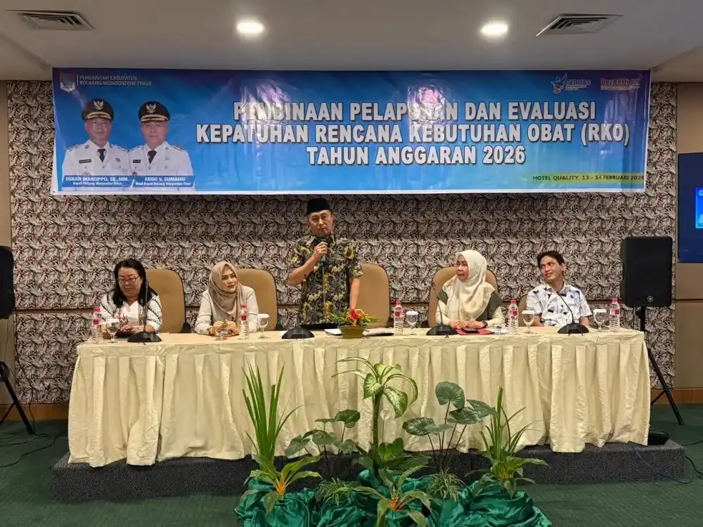Manado — Pemerintah Kabupaten Bolaang Mongondow Timur (Boltim) kembali menunjukkan komitmennya dalam memperkuat tata kelola kesehatan daerah. Mewakili Bupati Boltim, Oskar Manoppo, Wakil Bupati Argo V. Sumaiku hadir sekaligus membuka kegiatan Pembinaan Pelaporan dan Evaluasi Kepatuhan Rencana Kebutuhan Obat (RKO) Tahun 2026 yang digelar di Hotel Quality Manado. Jumat (13/2/2026).
